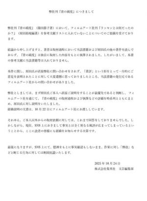 ■集英社・文芸編集部、『青の純度』めぐる“書評”に言及 風評に「断固抗議いたします」
