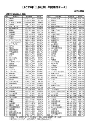 ■くまざわ書店 2025年出版社年間販売上位100社・分野別ランキング発表 朝日新聞出版が総合4ランクアップ