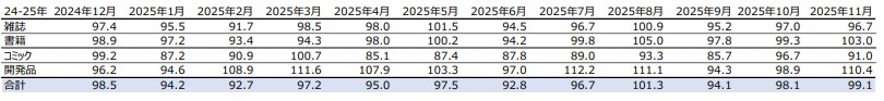 ■2025年11月期 店頭売上前年比調査 書籍が実用書以外の全ジャンル前年超えで103.0%、全体では99.1%