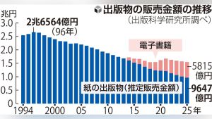■2025年出版市場(紙+電子)は1兆5462億円で前年比1.6%減、コロナ前の2019年とほぼ同規模 ~ 出版科学研究所調べ